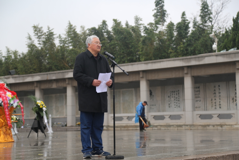 全体肃立奏国歌。随后哀乐缓缓响起,现场肃穆无声,全体成员满怀悲痛为革命先烈默哀三分钟。默哀完毕,学生代表向牺牲的烈士敬献花圈,表达对革命先烈们的瞻仰与缅怀之情。“五老关爱团”代表邓维生进行爱国主题教育演讲,他将艰苦卓绝的淮海战役娓娓道来,深切怀念英勇牺牲的革命烈士们,希望借他们的光辉事迹和爱国精神让学生们受到鼓舞,以此对学生们展开爱国主义和革命传统教育。紧接着,附中学生代表周廷轩发言,他在发言中表达了对淮海战役牺牲惨烈的震撼之意,同时更表达了对革命先烈们无畏精神的感动之情。他代表附中全体同学,表示作为新时代的接班人,一定会秉承先烈们爱国主义精神和艰苦奋斗的作风,成为祖国栋梁之才。最后,全体师生瞻仰纪念碑,向烈士们敬献白花,表达深切的哀思;绕塔一周聆听革命先烈英勇事迹,缅怀先烈丰功伟绩。统一祭扫活动结束后,各班由班主任组织带队参观徐州国防教育馆,感受淮海战役精神,体悟革命岁月风采。