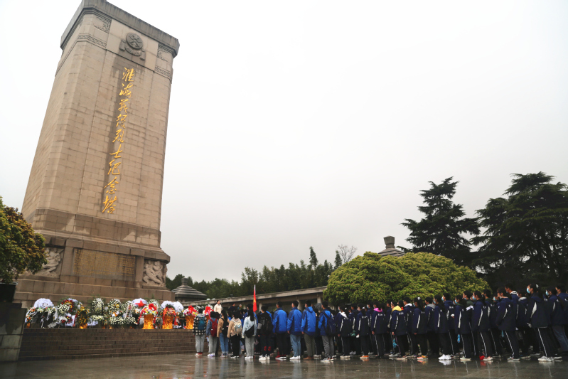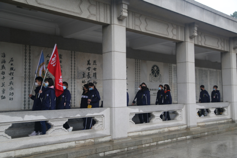 下午两点,参加祭扫活动的各位同学在淮海战役纪念馆集合完毕。怀着悲痛的心情,迈着沉痛的脚步,同学们缓缓登上石阶来到了淮海战役纪念塔塔下。