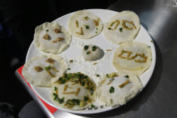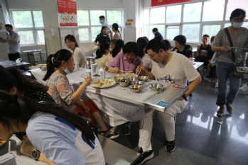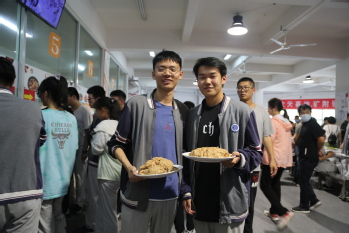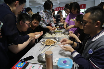 下午四时整,高三年级四个班级的所有学生、每位学生的一名家长以及所有的任课老师来到学校食堂。在食堂师傅们的精心布置下,食堂里张灯结彩、桌明几净。以班级为单位,每个班以五人为一组,每组在老师、家长的指导下进行包饺子。