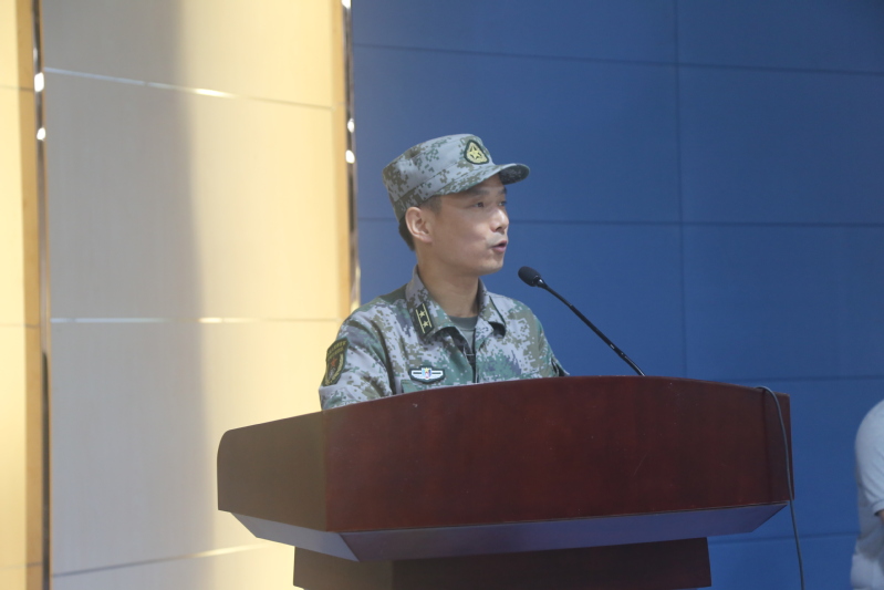 束永勇营长代表教官发言,束营长祝贺同学们实现了自己的心愿,考入了理想的学校。同时,束营长提醒同学们,国防教育训练是艰苦的,既要训练同学们坚强的意志,更要让同学们明白团队精神与规范意识的重要性,军训是对同学、老师和教官的一次考验。希望同学们能够克服困难、团结协作,圆满完成任务!