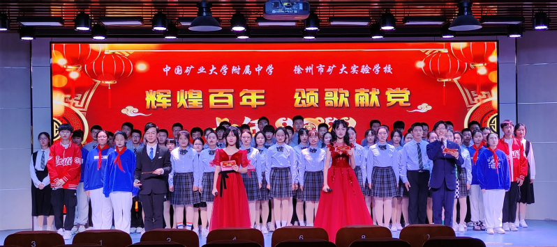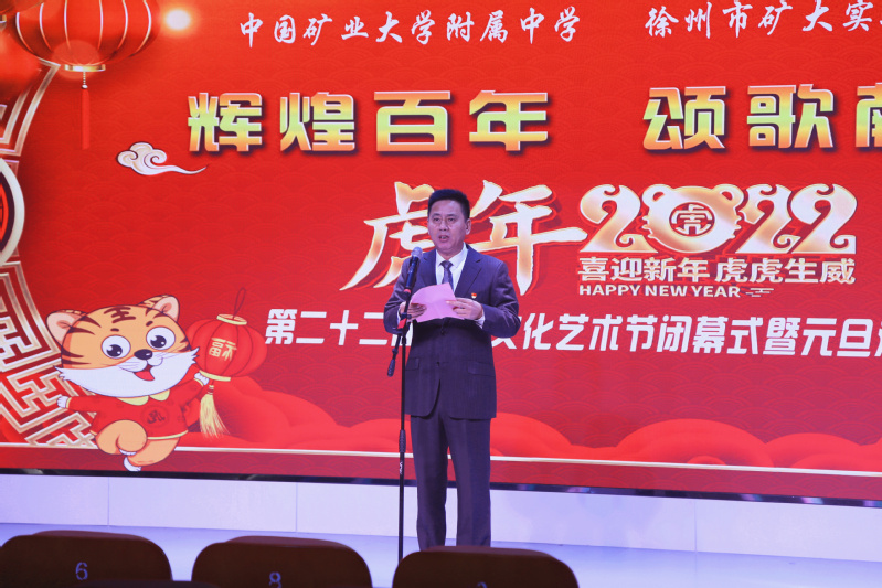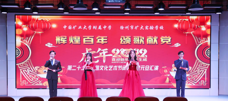 岁序更替,华章日新。时光描绘岁月印痕,2022年元旦如约而至。2021年12月31日下午我校举行“辉煌百年、颂歌献党”第22届校园文化艺术节闭幕式暨元旦汇演,中国矿业大学附属单位党总支书记、附属中学校长王健鹏,党总支副书记李洪涛,副校长张诚、黄永乔、武昌、赵祥伟等领导出席汇演。为响应疫情防控要求,我校将汇演现场设在讲习堂,全校师生在各班教室通过网络直播收看演出,全程感受节日氛围。