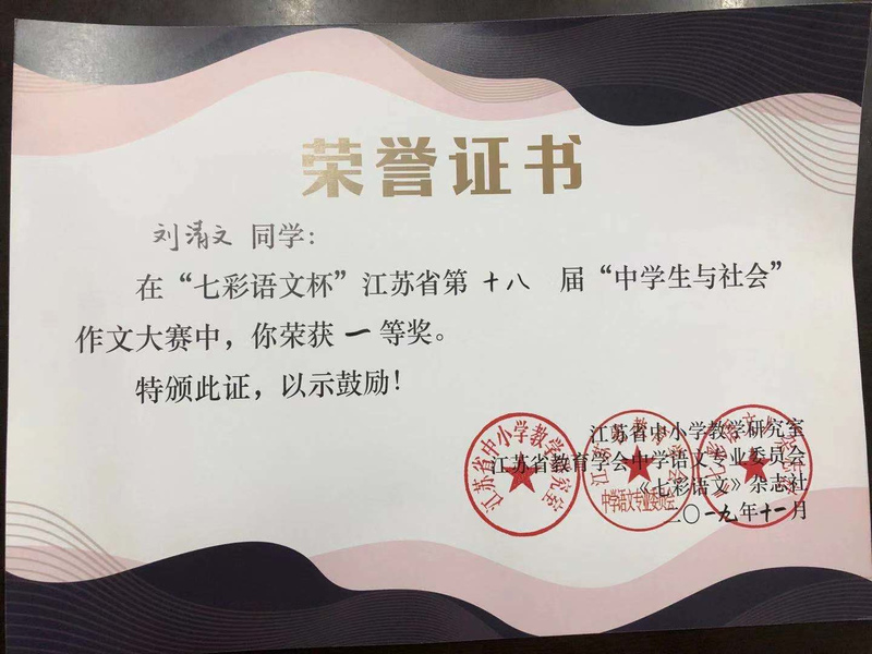 日前,在江苏省中小学教研室、江苏教育学会中学语文专业委员会等单位主办的江苏省第十八届“中学生与社会”作文大赛中,我校武昌老师指导的刘清文同学喜获江苏省一等奖。