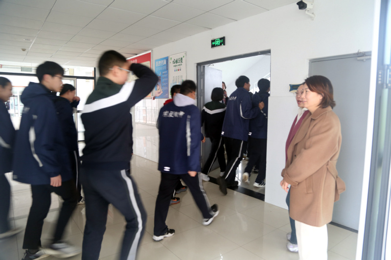 上午9:40,团委书记焦亮亮主持校会:介绍火灾逃生注意事项及疏散演练方法,提出具体要求。班主任在教室对学生进行指导。随着警报声响起,全校1800余名学生在班主任的安排下迅速、有序地撤离教室。学校各部门根据预案安排,校领导在各楼梯口指挥学生按照疏散路线,快速逃离到学校操场指定位置集合,期间未发生任何安全事故。