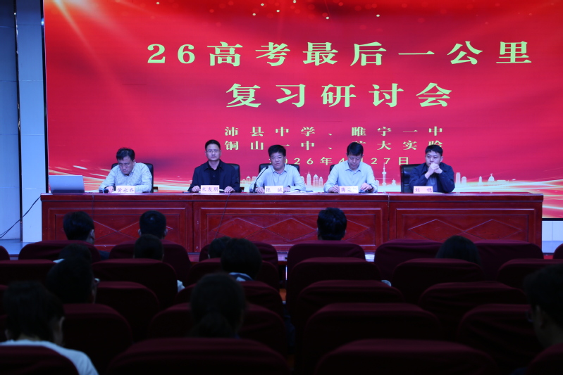 为精准把握2026年高考命题趋势,优化高三复习备考策略,凝聚校际智慧、实现精准备课,4月27日下午,由徐州市矿大实验学校主办的“26高考最后一公里复习研讨会”暨四校联合教研活动顺利举行。中国矿业大学附属中小学党委书记、徐州市矿大实验学校校长张诚,沛县中学副校长刘稳,睢宁一中副校长朱友朋,铜山一中副校长蒋荣振及各校骨干教师代表出席会议。徐州市矿大实验学校黄永乔副校长主持会议。