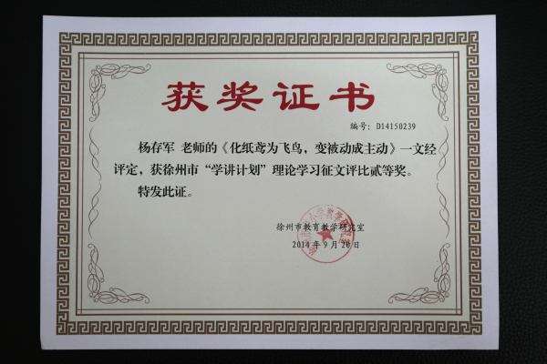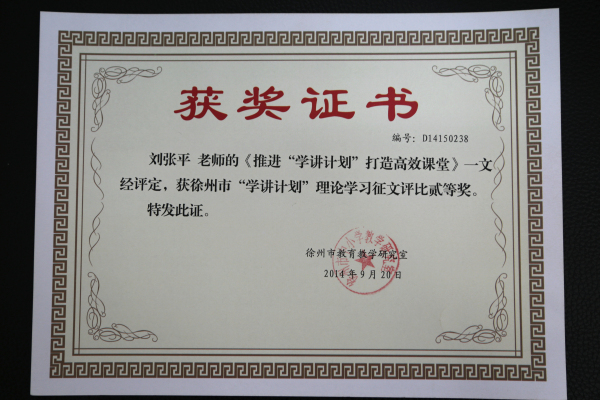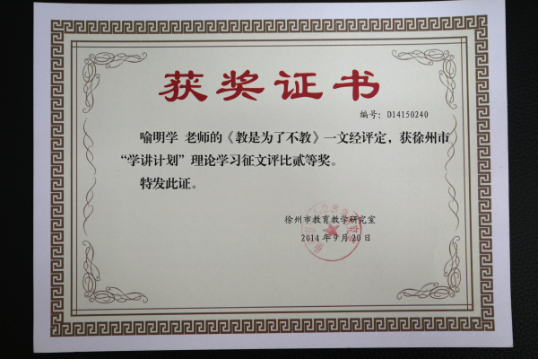 在2014年徐州市“学讲”心得论文评选活动中,喻明学、刘张平、杨存军三位老师荣获市级二等奖,王孝波、宋军、张舒三位老师荣获市级三等奖。