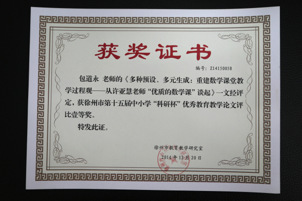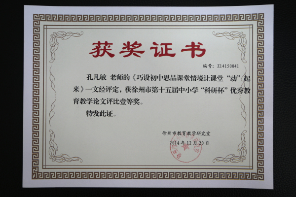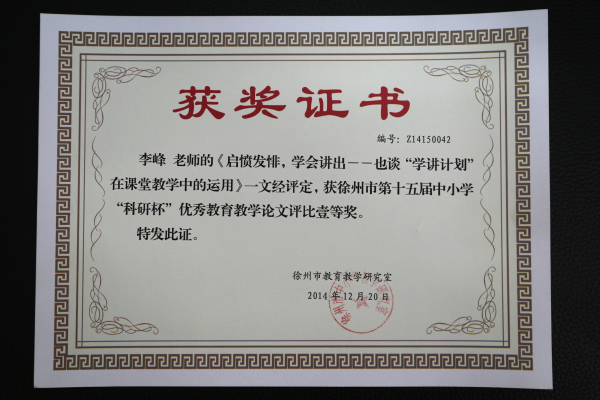 在2014年徐州市第十五届“科研杯”论文评选活动中,我校包道永、李峰、孔凡敏三位老师荣获市级一等奖,高成林老师荣获市级三等奖。