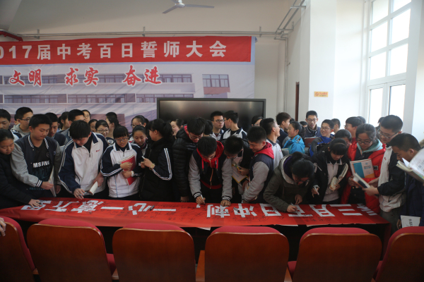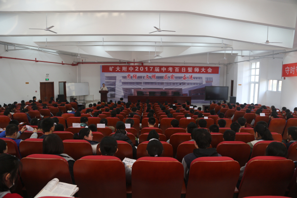 大会邀请了我校高一年级优秀学生代表刘天喆同学到会发言,她用真诚、朴实的语言介绍了自己的中考经历、高中现状以及学习体会,和同学们分享了“自立、惜时、感恩”的人生感悟,并为学弟学妹们加油鼓劲。初三学生袁勾如月代表全体学生表示决心,要拼搏百日,全力以赴,完成梦想,让青春无悔。教师代表杨双老师热情洋溢的讲话道出全体老师的心声:愿与同学们一道攻坚克难,奋战百天,甘心做学生成功的铺路石。张诚副校长代表学校作了振奋人心的动员,他回顾了我校近十年来中考的骄人成绩,希望同学们在这一百天里要有拼搏的精神,更要有勇于面对困难,挑战困难的行动,要求初三全体师生传承矿大附中的优良传统,坚定信心,刻苦努力,圆梦中考。最后,全体初三学子高举右手庄严地宣誓:目标明确,自信自强,勤学苦练,意志如钢,讲究方法,奋勇远航,挑战自我,乘风破浪,团结互助,共创辉煌,拼搏百天,笑傲考场,全力以赴,圆我梦想!
