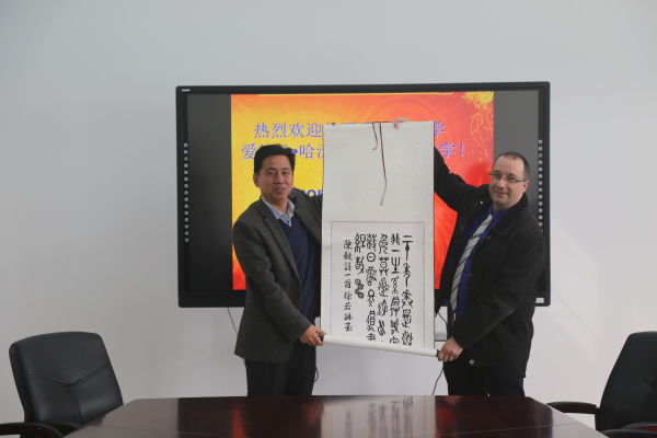 王校长向哈沃斯教授来我校讲学表示感谢,还介绍了我校的办学情况和办学特色,并代表学校赠送了学生的书法作品。
