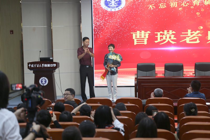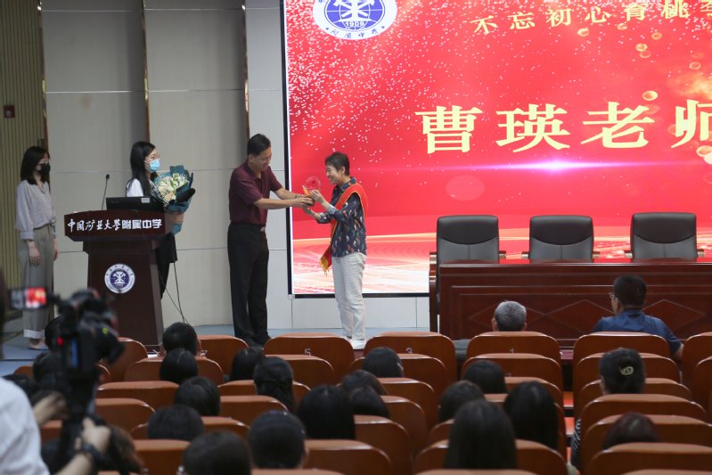 立德树人满桃李,薪火相传矿附情。为进一步加强对退休教师的关心、关怀,增强集体和个人荣誉感和归属感,激励新一代青年教师不忘初心,接续奋斗,进一步提升矿大附中教育教学质量。我校于2022-2023学年度开学之际,在讲习堂举行了曹瑛老师荣退仪式,欢送曹瑛老师光荣退休。学校全体领导班子和全体教职工参加了仪式,仪式由附属单位党总支书记、附属中小学校长王健鹏主持,会场气氛热烈,情意浓浓。
