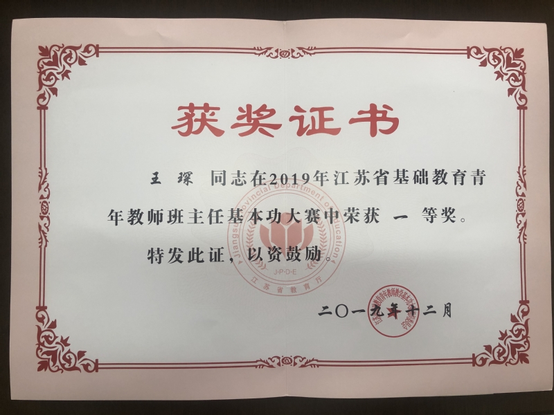 在江苏省教育厅主办的2019年江苏省基础教育青年教师班主任基本功大赛中,来自全省13个地级市的优秀青年教师参赛。经过激烈的角逐,我校王琛老师喜获江苏省班主任基本功大赛一等奖。