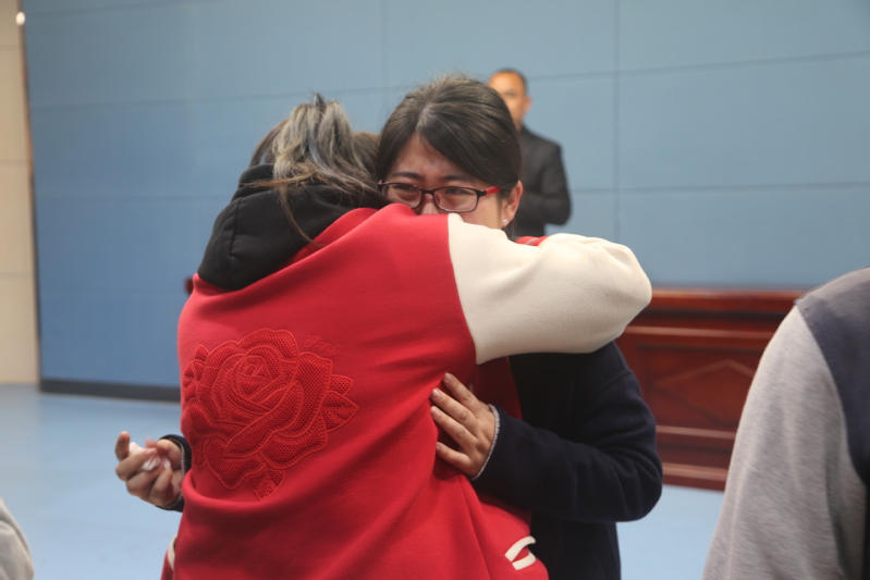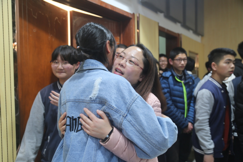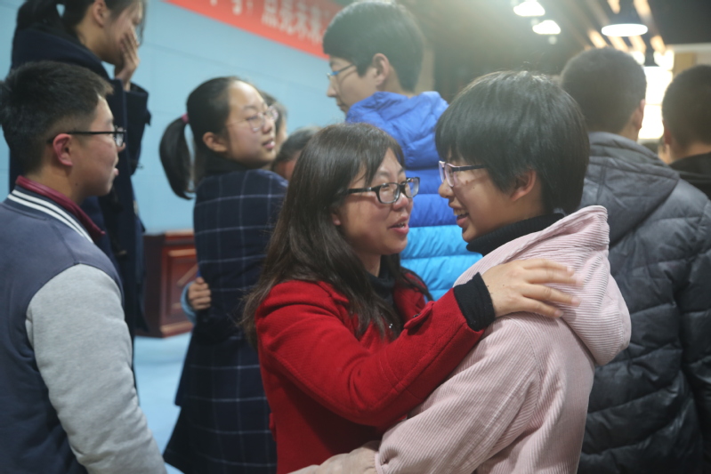 接着,徐老师将各个班的班主任老师请到台前,音乐响起,所有的孩子们都冲到老师跟前,拥抱自己亲爱的老师,对他们说声“谢谢您,您辛苦了。”老师们的脸上都挂着泪珠,同学们也都泣不成声。但那一刻,他们是幸福的,他们找到了中考目标,他们由衷感谢无怨无悔帮助自己实现目标的敬爱的老师!