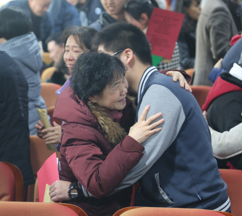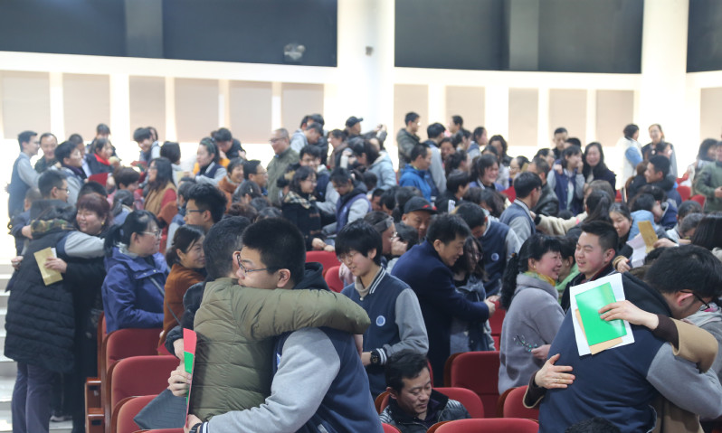 紧接着,伴随着轻柔感人的歌曲《时间都去哪儿了》,全体家长与学生互换信件,互吐心声,孩子们情不自禁地与家长热情相拥,家长们也流下了激动的泪水,整个会场沉浸在成长的回忆和温情中。