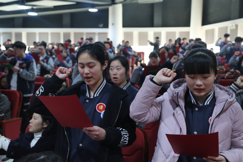 最后,在叶千硕同学的带领下,高三各班同学整齐站立,紧握右拳,高声宣誓,他们用响彻云霄的铮铮誓言表达内心的渴望,用坚定的神情展现决战高考的勇气和力量,震天的宣誓声再次让会场激情澎湃。
