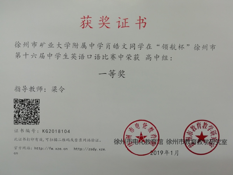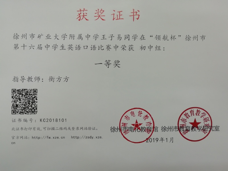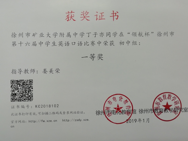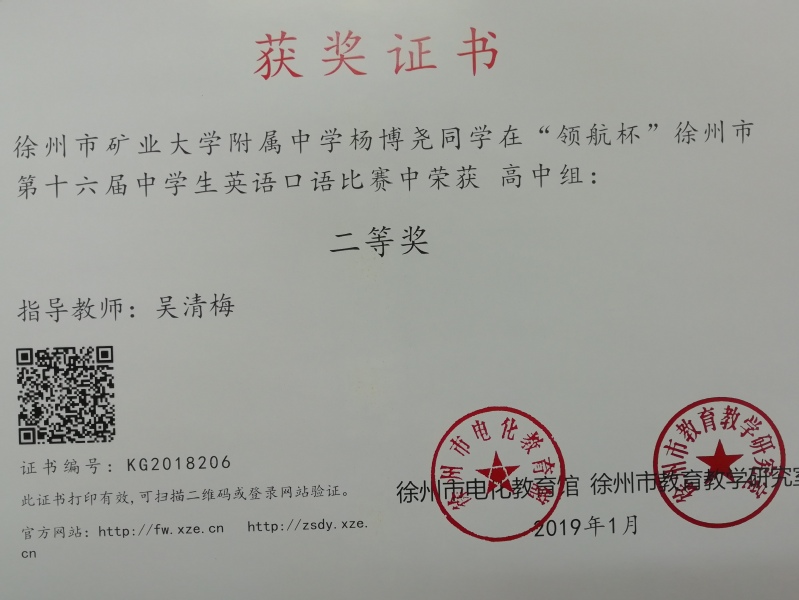 2018年12月我校衡方方指导的初三年级王子易同学、娄美荣老师指导的初二年级丁子亦同学在”领航杯”徐州市第十六届中学生口语比赛中荣获初中组一等奖;我校梁令老师指导的高一年级肖皓文同学荣获高中组一等奖;吴清梅老师指导的杨博尧同学荣获高中组二等奖,祝贺以上获奖同学。