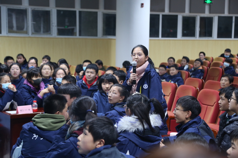 下午5时大会正式开始,主持人卢若瑜与刘姝含介绍了本次大会的内容与目的。大会分为“诗词接龙”“争分夺秒”两个环节,每个环节前都有两道热身题目,供选手们调试抢答器,进行人员分工。选手摩拳擦掌、跃跃欲试,观众静心以待,会场内的气氛陡然紧张起来。在“诗词接龙”环节中,选手们屏息敛声,目不转睛地盯着大屏幕准备作答,战况甚是激烈。在此环节,初一(4)班与初二(4)班选手表现突出,初二(2)班紧随其后。在“争分夺秒”环节中,各班轮流答题,在此环节中每个班级都表现良好,初一(2)班、初一(3)班、初二(3)班、初二(4)班和初二(5)班都取得了满分,可见选手们的诗词储备量之大。